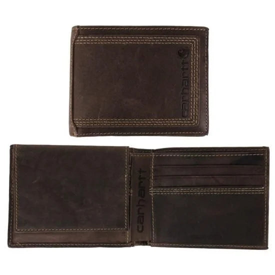 Hand stitching and an embossed Carhartt logo give this men's passcase a rugged look. It's made of top-grain leather, with a sweat-resistant patch that helps keep the wallet dry. The billfold is lined with cotton duck.
