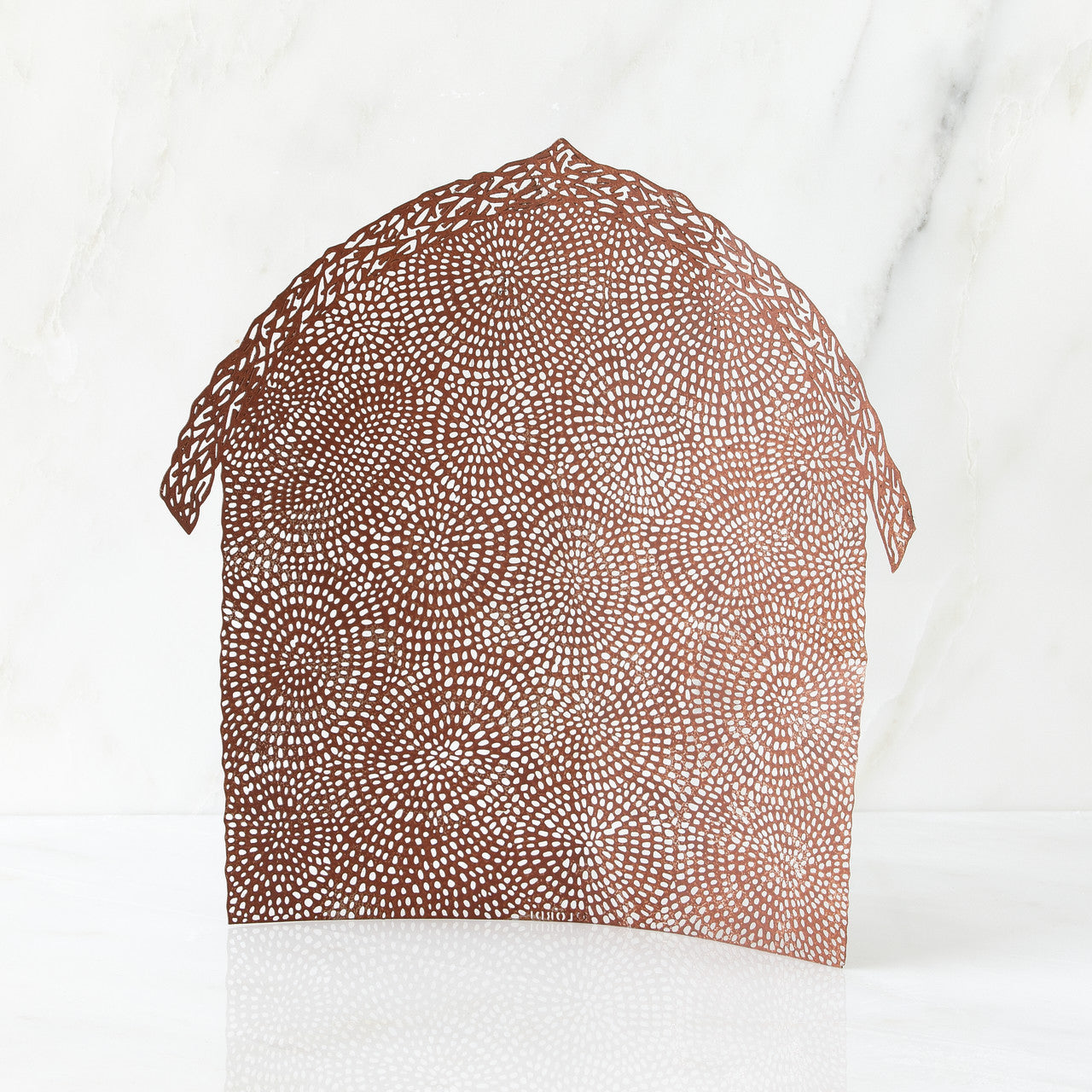 - Arched, rust-colored pierced-metal backdrop, patterned with branches and swirling circles of dots. Sized to complement The Holy Family nativity set